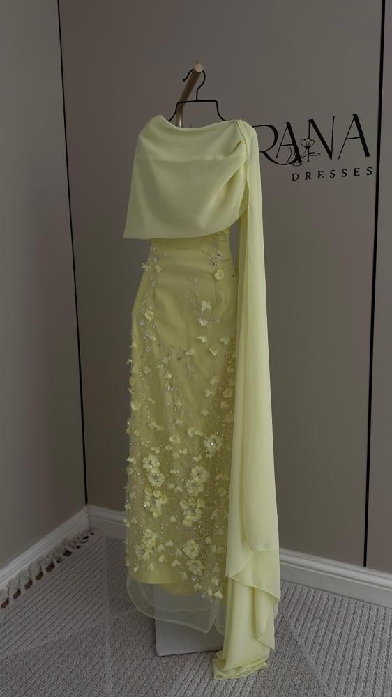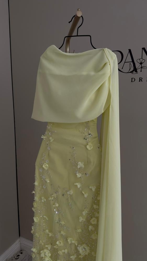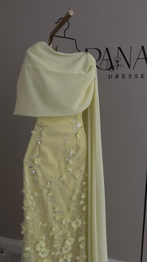 نوع التصميم/ فستان سهرة بلون أصفر فاتح بتصميم أنيق وطابع ناعم، يتميز بتطريز فاخر من الخرز والزهور ثلاثية الأبعاد التي تغطي الجزء السفلي من الفستان، مع شال شيفون بنفس اللون يضفي لمسة أنثوية راقية.