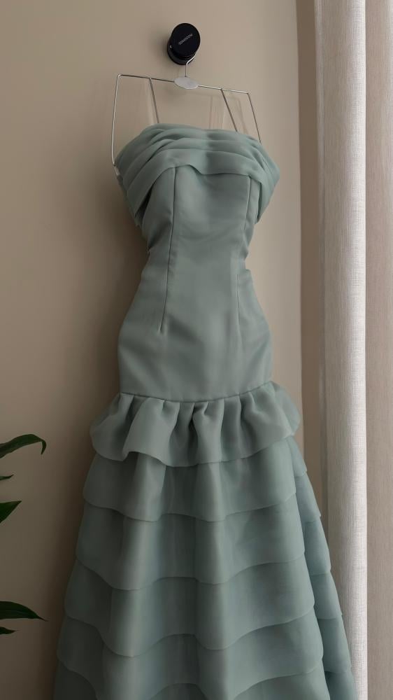 نوع التصميم/ فستان سهرة أنيق باللون التيفاني، تصميمه بدون أكمام وبصدر مطوي بخطوط ناعمة، ينسدل بقصة ضيقة حتى الخصر ثم يتوسع بتنورة بطبقات أفقية متدرجة تمنحه لمسة راقية وأنثوية مميزة.