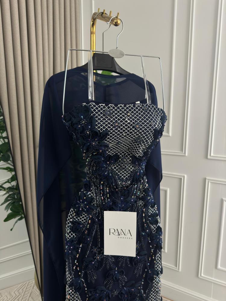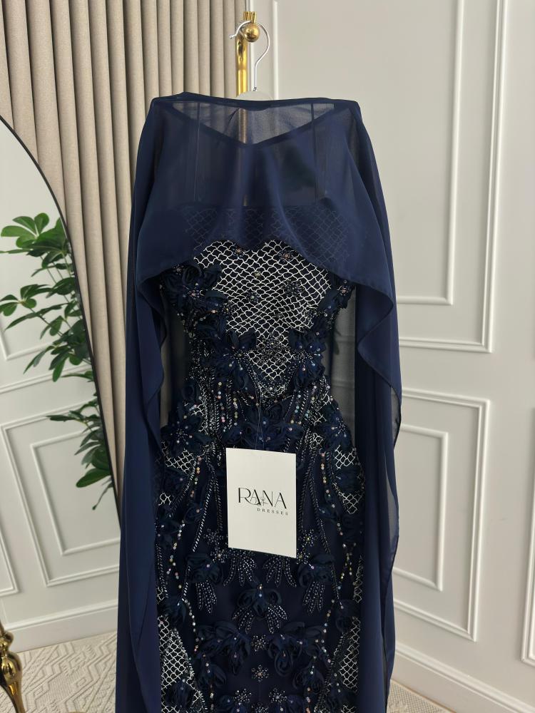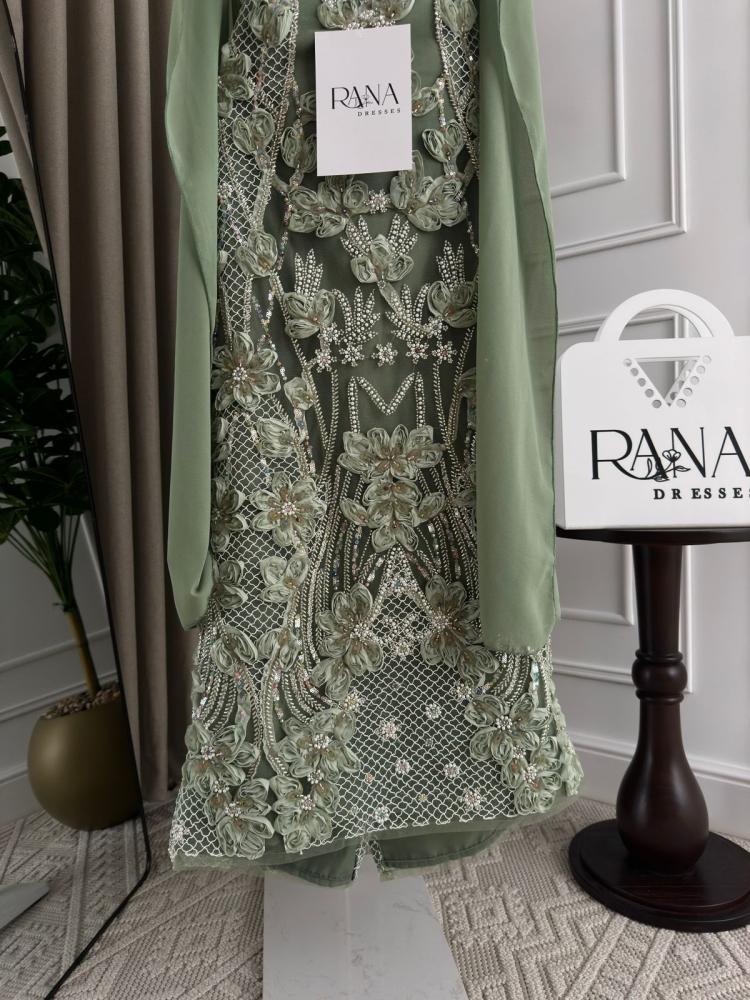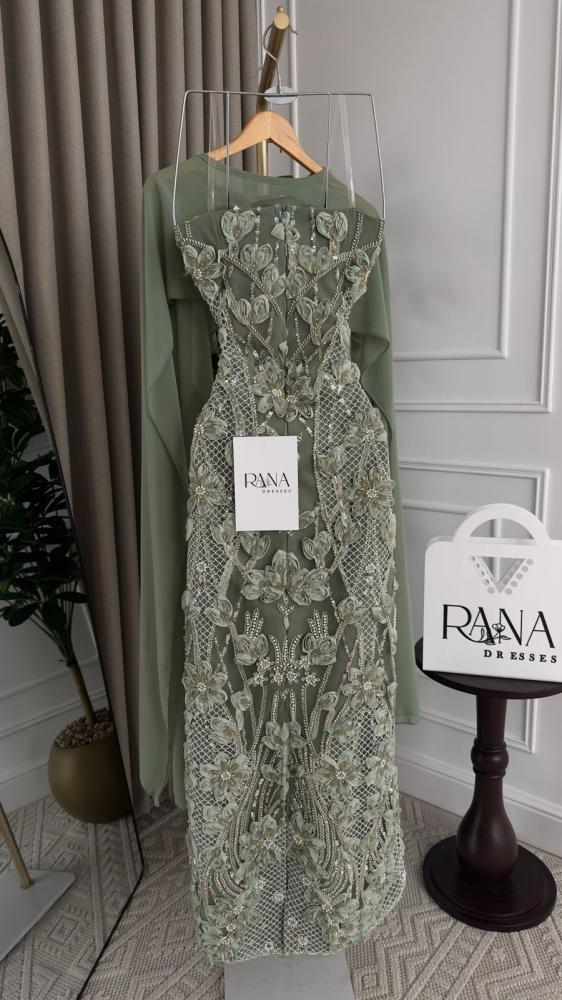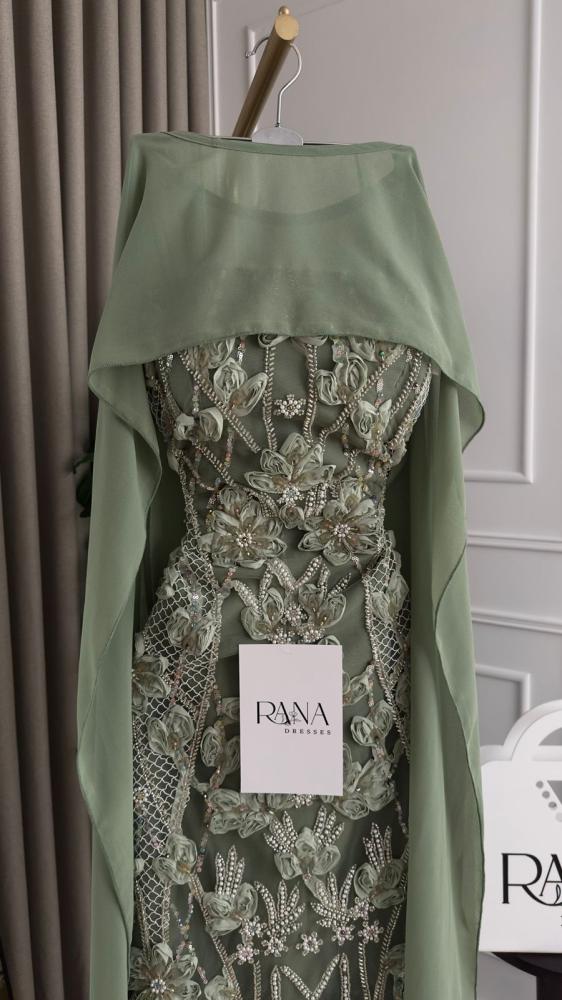 نوع التصميم/فستان سهرة فخم باللون الأخضر الزيتي الفاتح، مزدان بتطريزات ثلاثية الأبعاد وزخارف لؤلؤية فاخرة، مع قماش شيفون منسدل على الأكتاف يمنح إطلالة أنثوية راقية ومظهرًا ملكيًا متكاملًا.