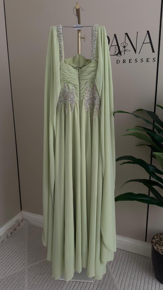 نوع التصميم/ فستان سهرة بلون فستقي ناعم، يتميز بتصميم صدر مكشكش يضفي لمسة أنثوية أنيقة، مع حمالات وتطريز لؤلئي فاخر يزين الخصر بتفاصيل لامعة. الأكمام الطويلة تنسدل بانسيابية لإطلالة ملوكية راقية. تصميم ناعم يخطف الأنظار بألوانه وتفاصيله الراقية.
