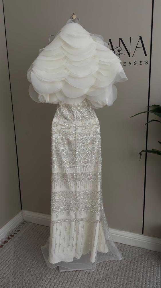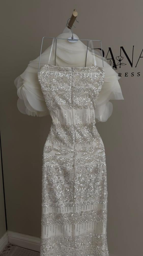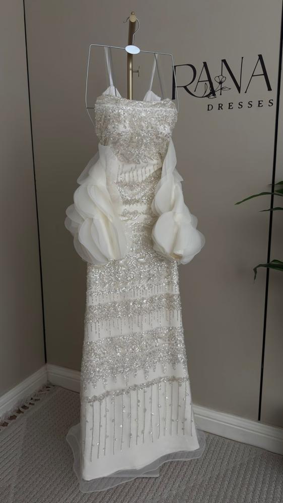 نوع التصميم/ فستان سهرة أبيض أنيق بتطريز فضي لامع بالكامل، تصميم ضيق يبرز القوام، مزين بكشكشات جانبية من الشيفون لإضافة لمسة فخامة وأنوثة.
