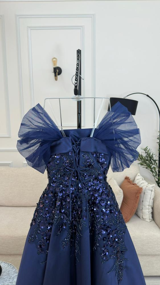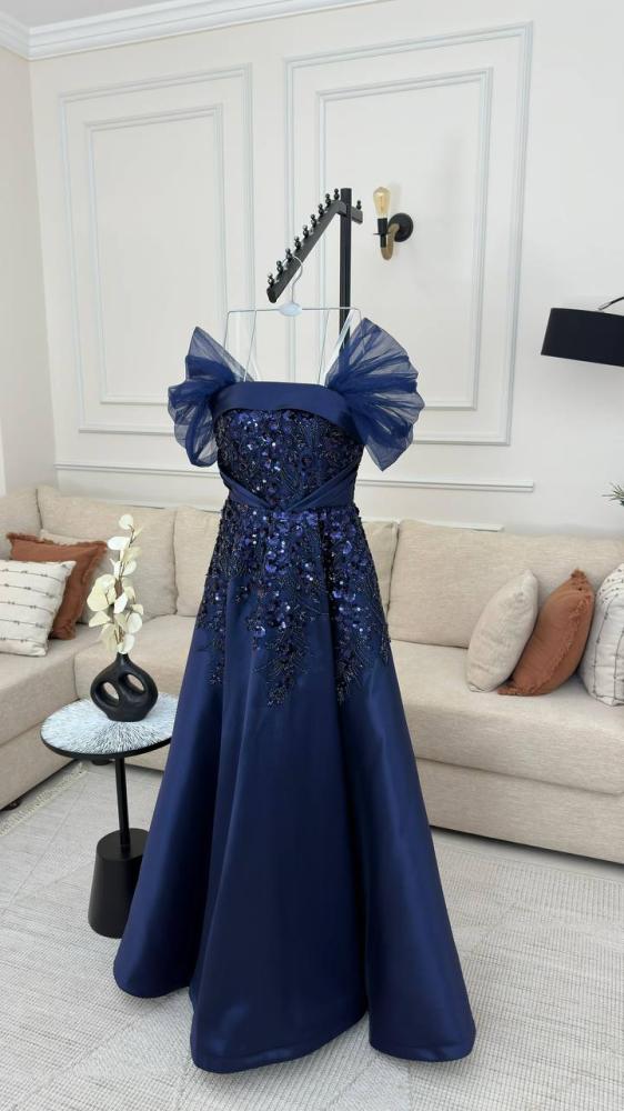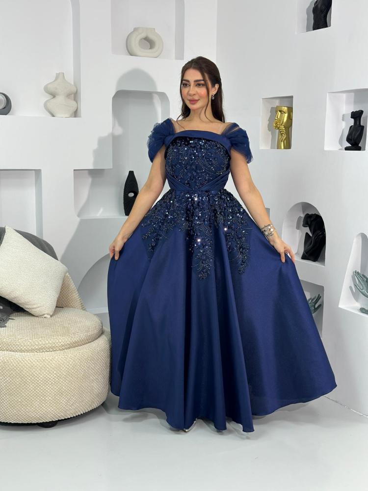 نوع التصميم/ فستان سهره كحلي مطرز بخرز ويتميز بأكتاف تل