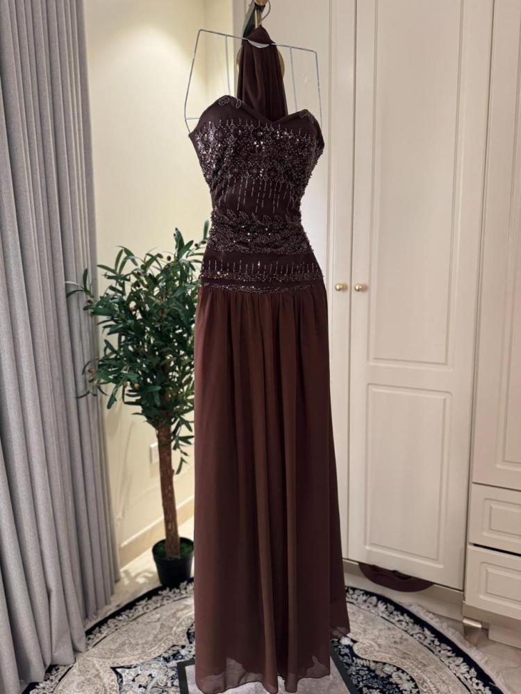 نوع التصميم/ يتميز الجزء العلوي بتطريزات براقة وخرز لامع بتصميم متقن . بينما الجزء السفلي مصنوع من القماش الشيفون الناعم . ويتميز بقصة بدون اكمام , ويبدو مثالياً للمناسبات الرسمية او السهرات