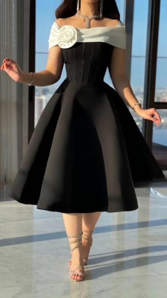 نوع التصميم/ فستان ميد يتميز بأكتاف بيضاء من الخامه التفته مزين بورده بارزه