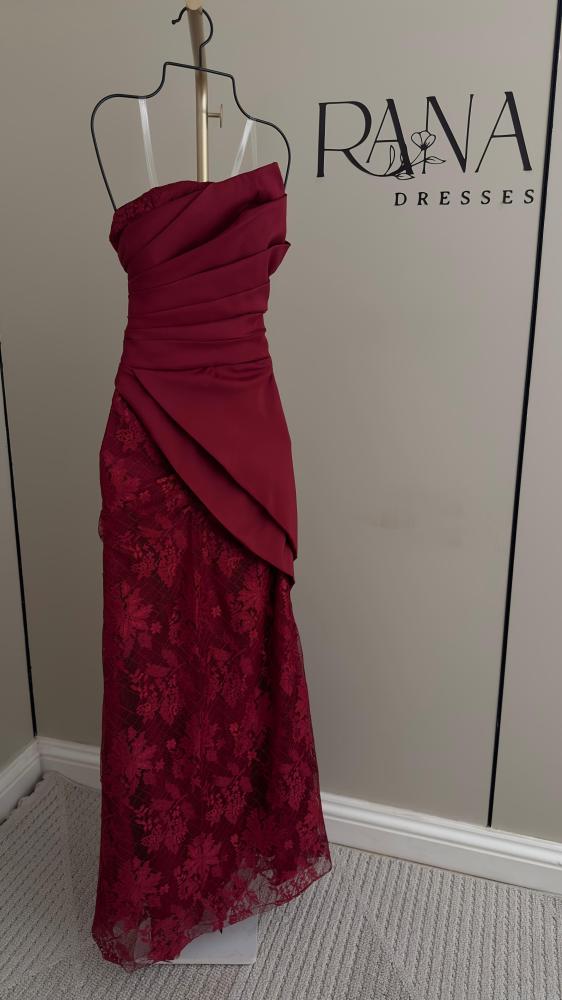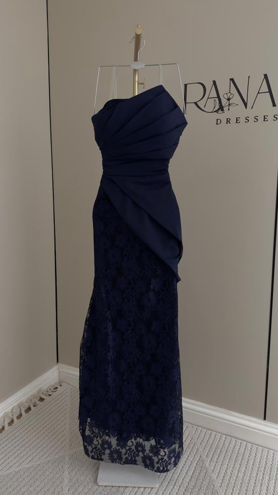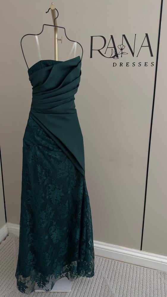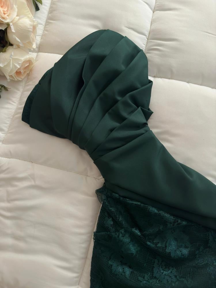 نوع التصميم/ فستان سهرة أنيق بلون أخضر زمردي، يتميز بقصة ناعمة مع طيات علوية مائلة تضيف لمسة من الرقي. التنورة طويلة مصنوعة من دانتيل فاخر بنقشات زهرية، ما يضفي أنوثة وفخامة ناعمة على الإطلالة. مثالي للسهرات الراقية والمناسبات الخاصة.