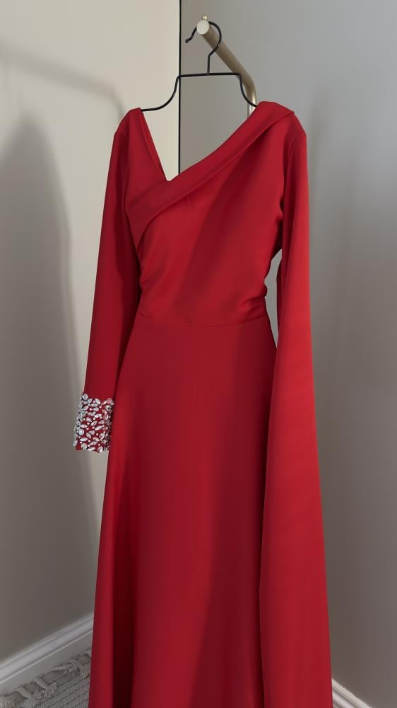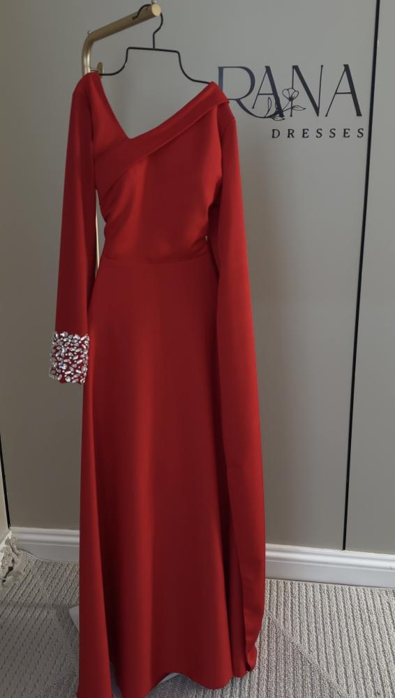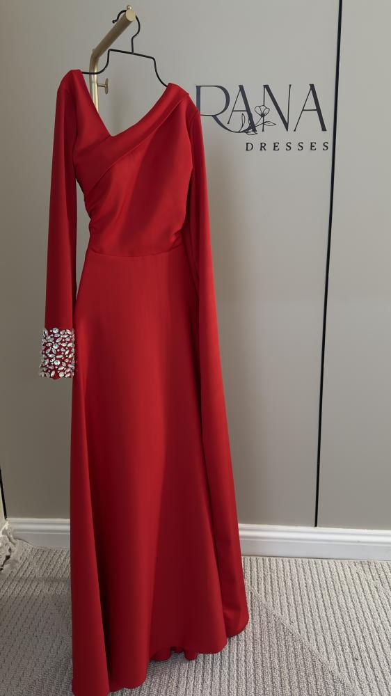 نوع التصميم/ فستان سهره ناعم يتميز بكم طويل وكم مزين بكريستال