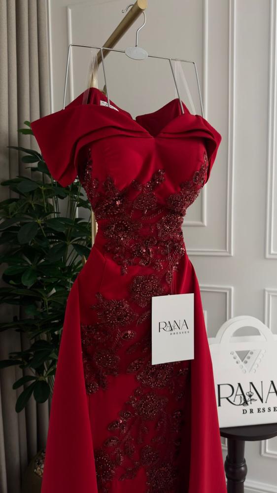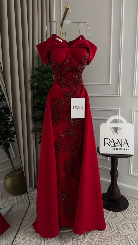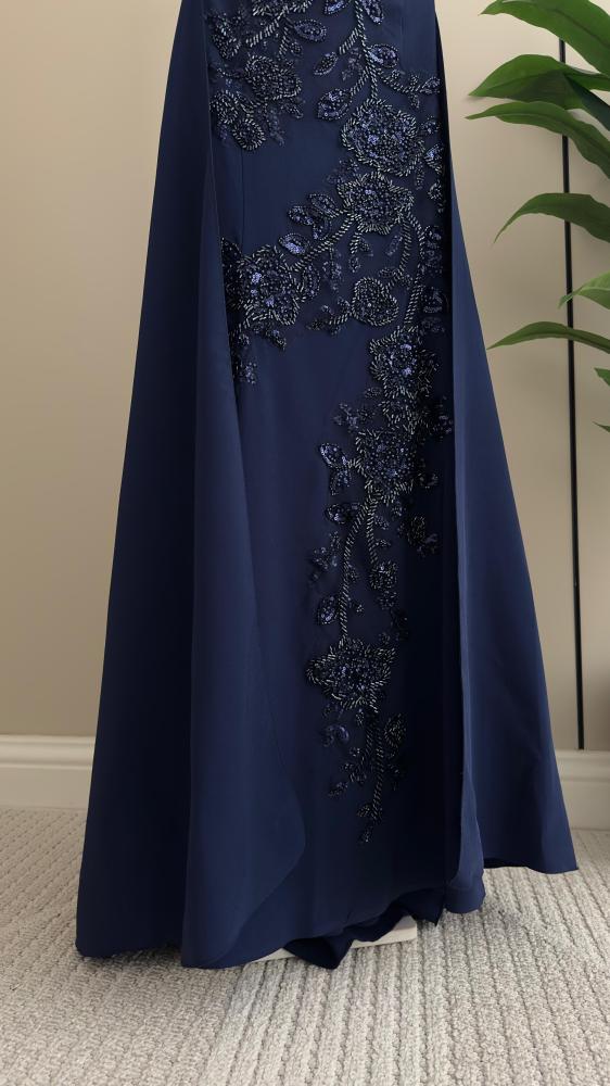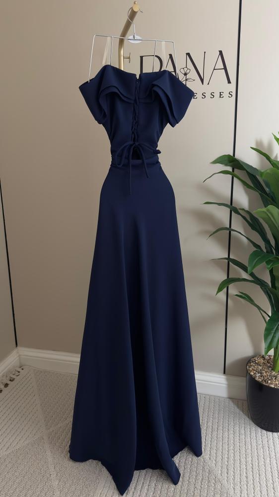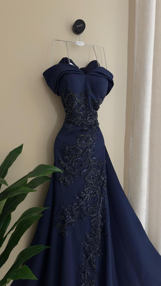 نوع التصميم/ فستان سهرة فخم بلون كحلي أنيق، يتميز بتصميم أوف شولدر مميز مع تفاصيل مطرزة يدوياً بزخارف زهرية لامعة تنساب من الصدر حتى التنورة. قصة الفستان واسعة من الأسفل مع قصة ذيل عريض تضيف لمسة ملكية ساحرة. خيار مثالي للإطلالة الفاخرة في المناسبات الخاصة.